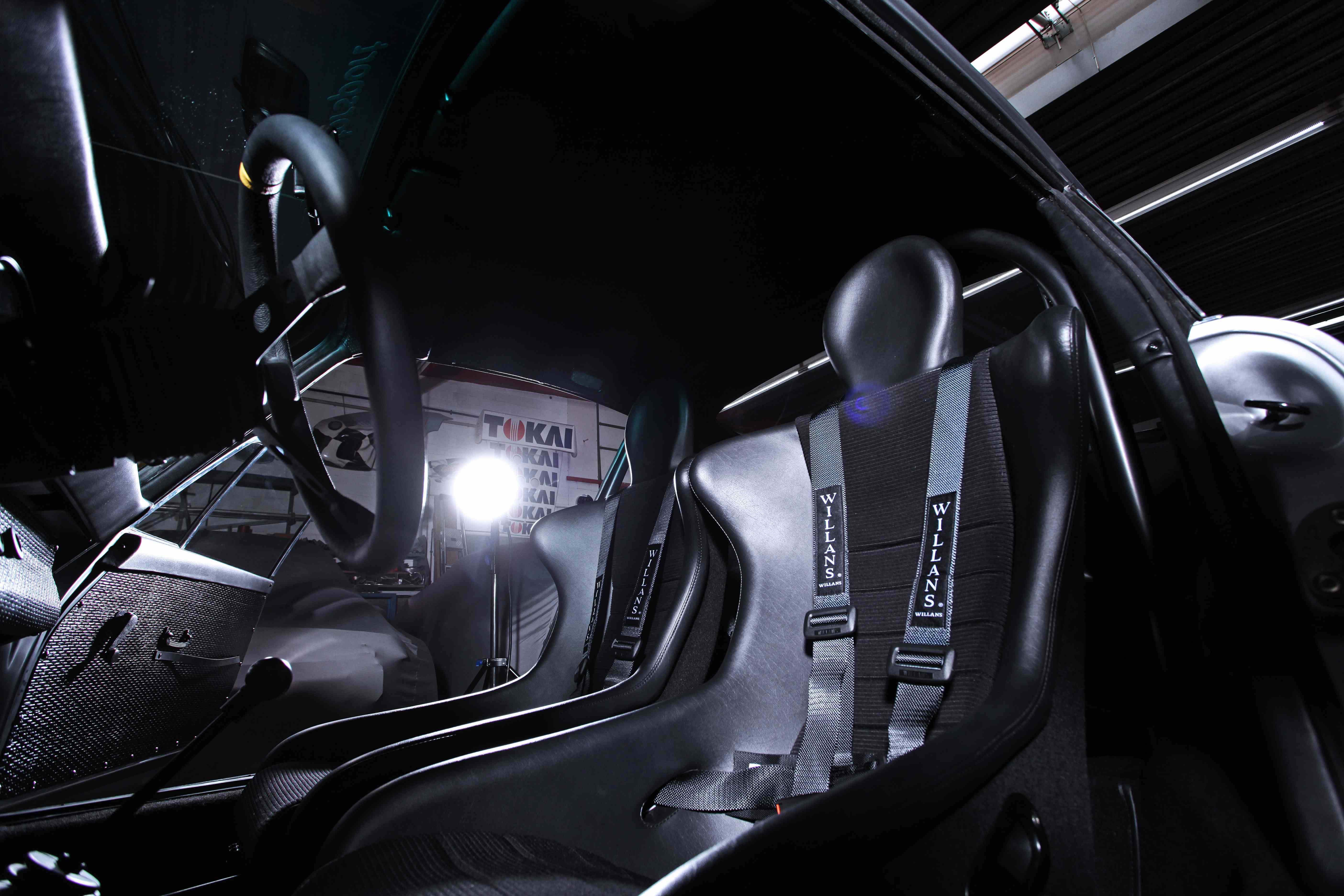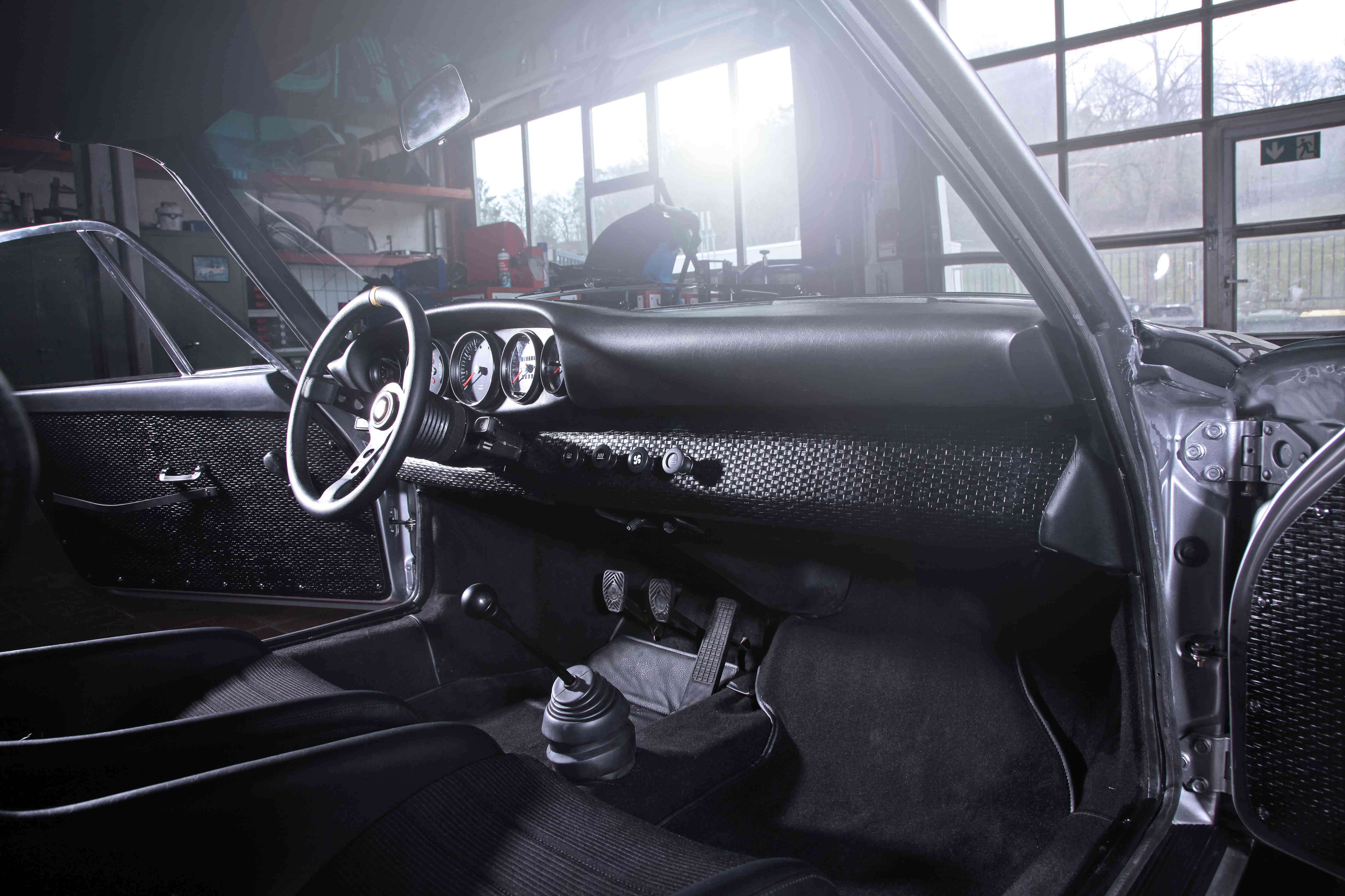 Das Interieur greift das Leichtbau-Konzept konsequent auf: Die Profilschalensitze im klassischen „Lollipop“-Design mit Mittelbahnen aus Scheel-Stoff und Kunstleder an den Sitzwagen beherrschen den Fahrgastraum, sie bieten erstklassigen Seitenhalt wie einst im Porsche 935 turbo der späten siebziger und frühen achtziger Jahre. Aufgrund der Rennsport-nahen Auspuffanlage mit jeweils einem Fächerkrümmer pro Zylinderseite muss auf Wärmetauscher und damit auch auf eine konventionelle Heizanlage verzichtet werden. Stattdessen übernimmt ein minimalistischer Keramik-Heizlüfter die Beheizung des Fußraums. Die Windschutzscheibe wird durch eingelassene, elektrische Heizdrähte beschlagfrei gehalten. Weitere Features sind die authentischen Willans-Vierpunkt-Hosenträgergurte, der hauseigene Überrollbügel des Typs dp-911 R/ST, das Momo-Sportlenkrad mit 350 Millimetern im Durchmesser, überarbeitete Armaturen, der Leichtbau-Teppichsatz in schwarzem Filz sowie die Knieleisten und die Innenverkleidungen der Türen aus grob geflochtenem, mit Glasfaser verstärktem Kunststoff. Eine nachträglich installierte, elektrische Servolenkung, das Heckfenster aus gewichtsoptimiertem Plexiglas und die Leichtbau-Batterie in einem speziellen Aluminiumrahmen lassen die Ausstattung schließlich komplett werden.